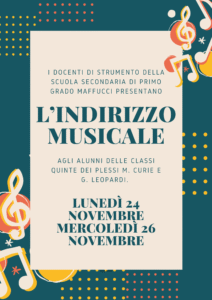 Nei giorni lunedì 24 novembre e mercoledì 26 novembre i docenti di strumento illustreranno alle classi quinte delle scuole primarie M.Curie e G.Leopardi le attività e le opportunità offerte dall’Indirizzo Musicale. Un’occasione per avvicinare i futuri studenti al mondo della musica e promuovere la continuità educativa tra primaria e secondaria.