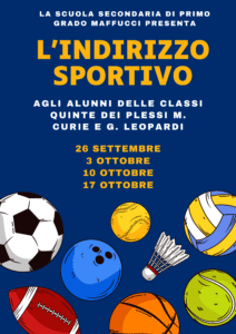 Gli alunni e le alunne delle classi quinte dei plessi M. Curie e G. Leopardi parteciperanno in orario curricolare alla presentazione dell’Indirizzo Sportivo presso la Palestra della scuola secondaria Maffucci.